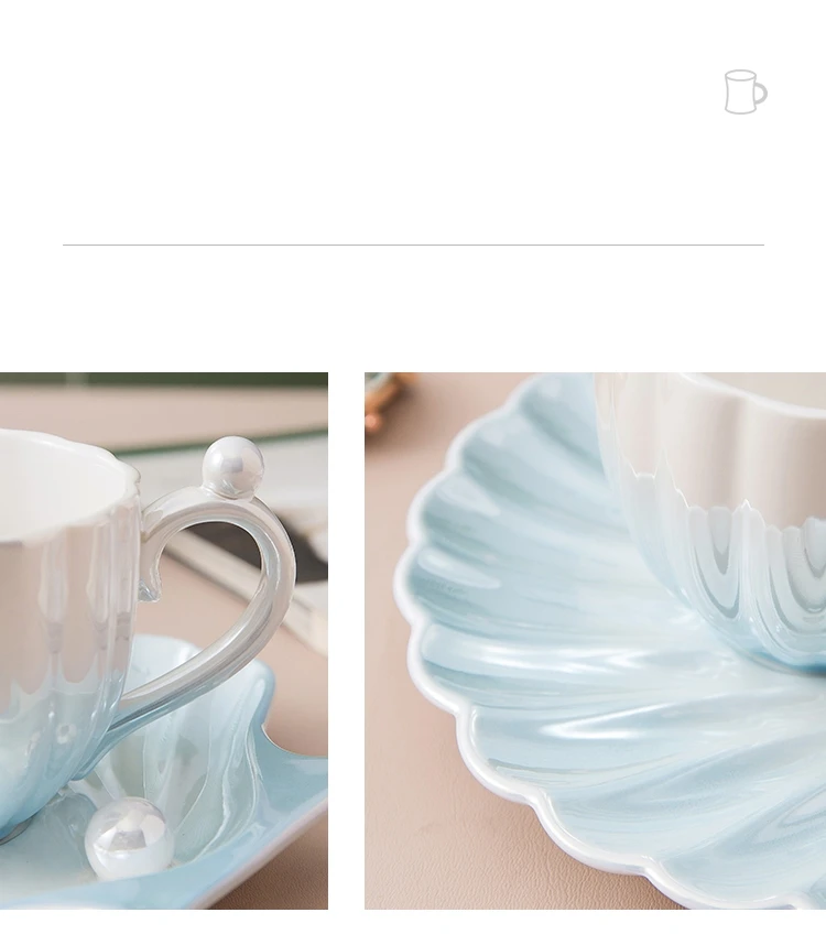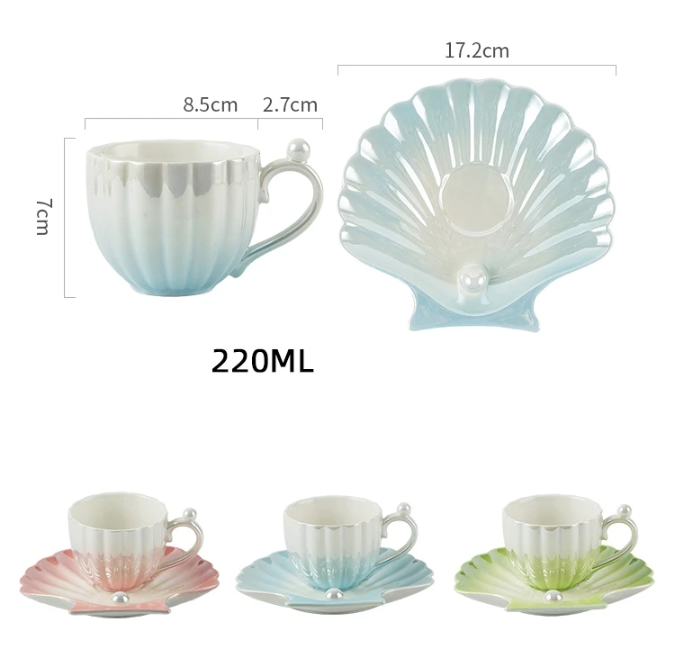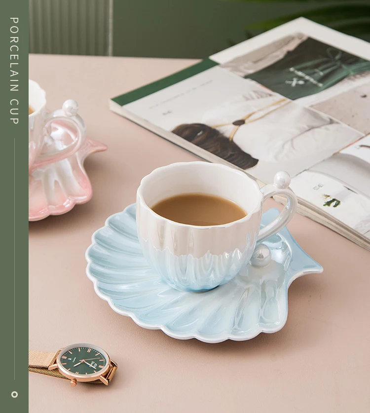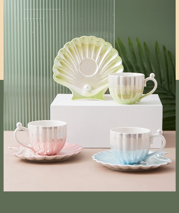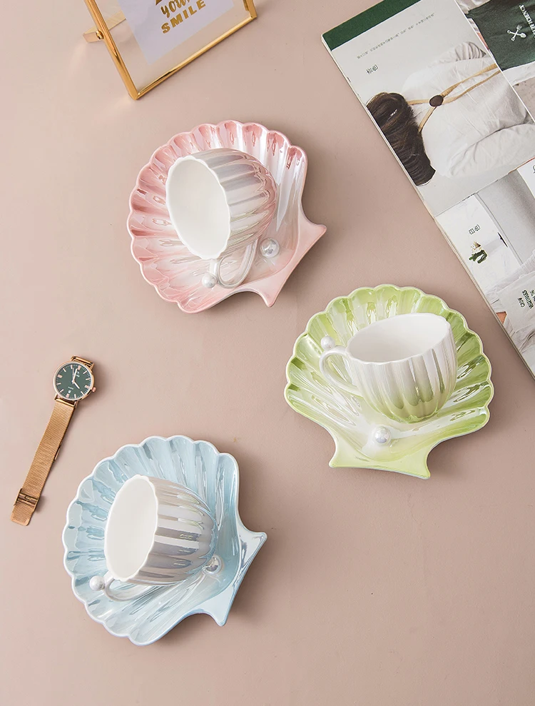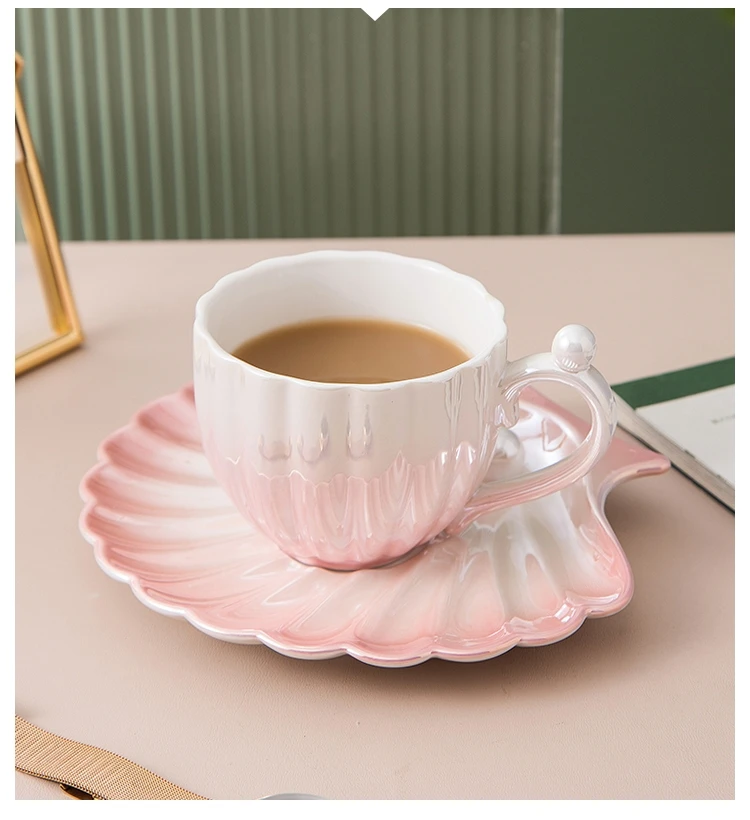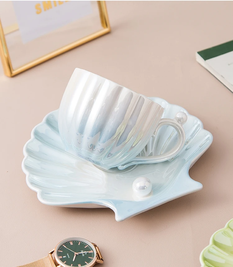 كوب سيراميك بتصميم صدف لؤلؤي مع صينية أنيقة