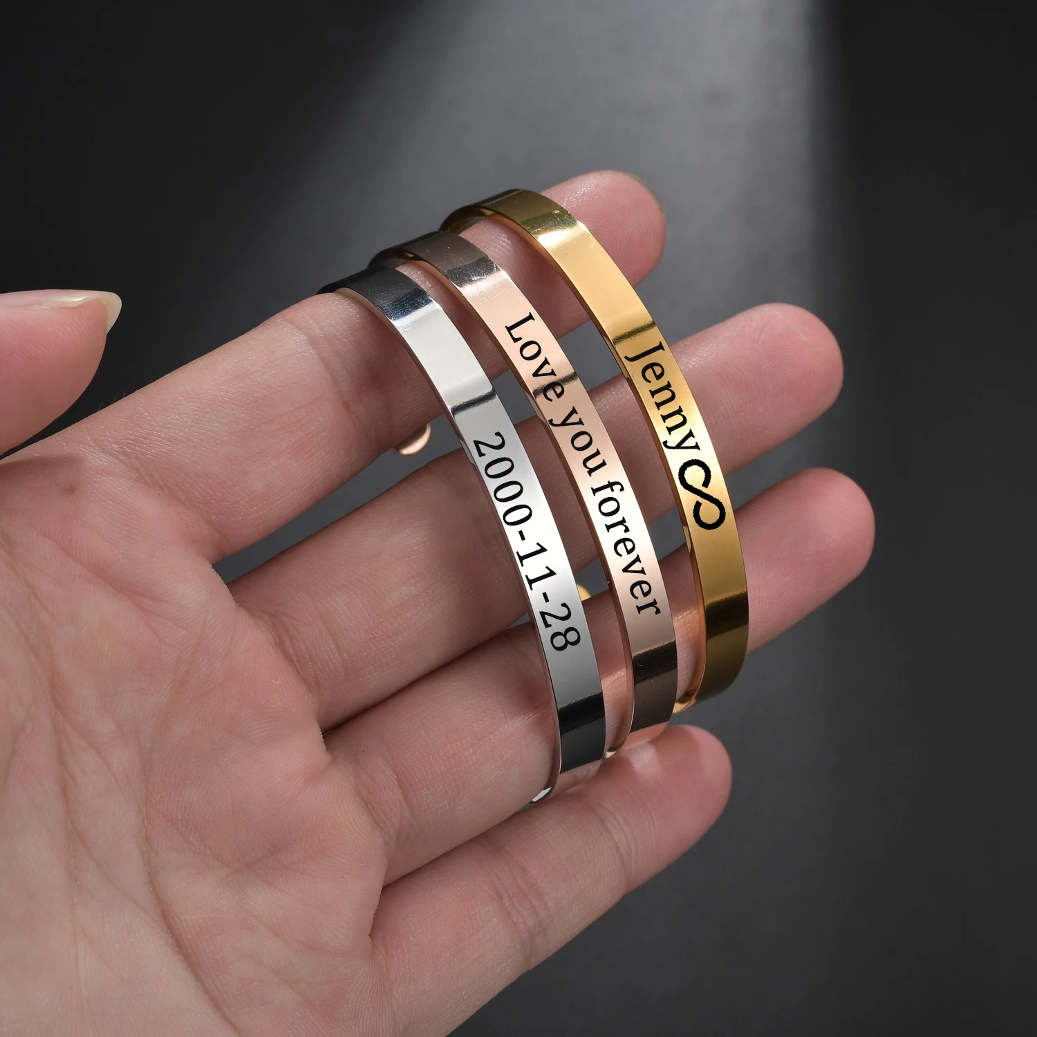 إسوارة أنيقة من الفولاذ المقاوم للصدأ، يمكن نقش الاسم أو التاريخ عليها لتصبح قطعة مميزة تحمل لمسة شخصية فريدة. تصميمها العصري القابل للتعديل يناسب جميع المقاسات، مما يجعلها هدية مثالية للمناسبات الخاصة مثل الأعياد أو أعياد الميلاد أو الذكريات المميزة.